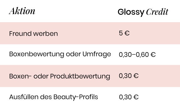 Ganz einfach. Hinterlasse Kundenrezensionen für die Produkte in deiner GLOSSYBOX, fülle die monatlichen Umfragen aus, vervollständige dein Beauty-Profil und verdiene bis zu 14 Euro Credits, wenn du einen Freund wirbst. Lehn dich zurück und schaue zu wie deine Credits wachsen!